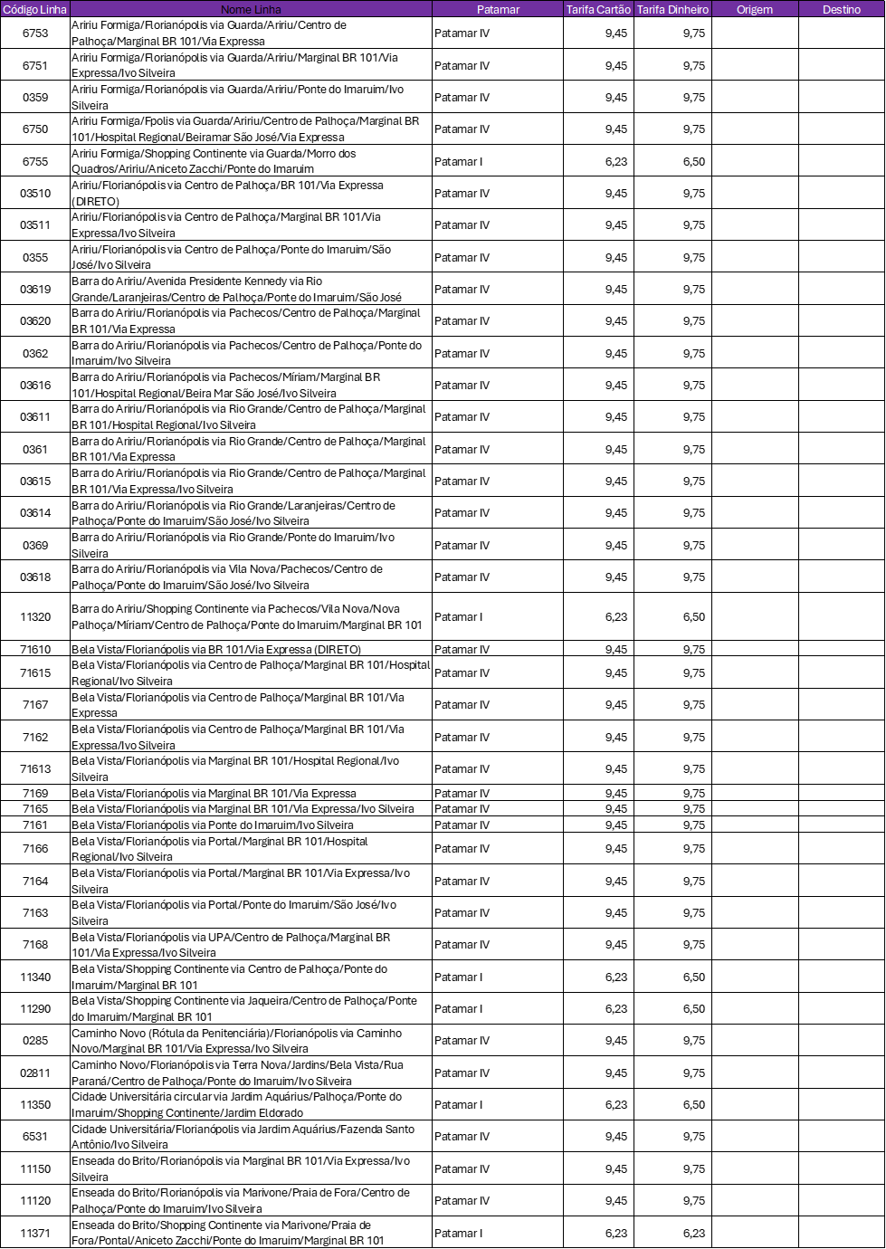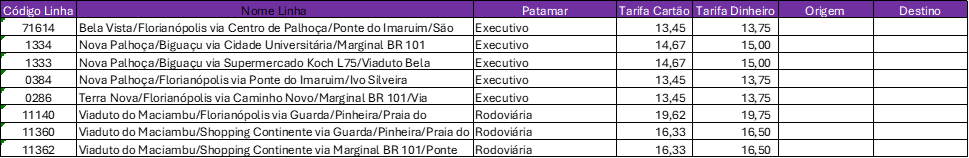 - Tabela 4, 5, 6 e 7: Linhas Municipais